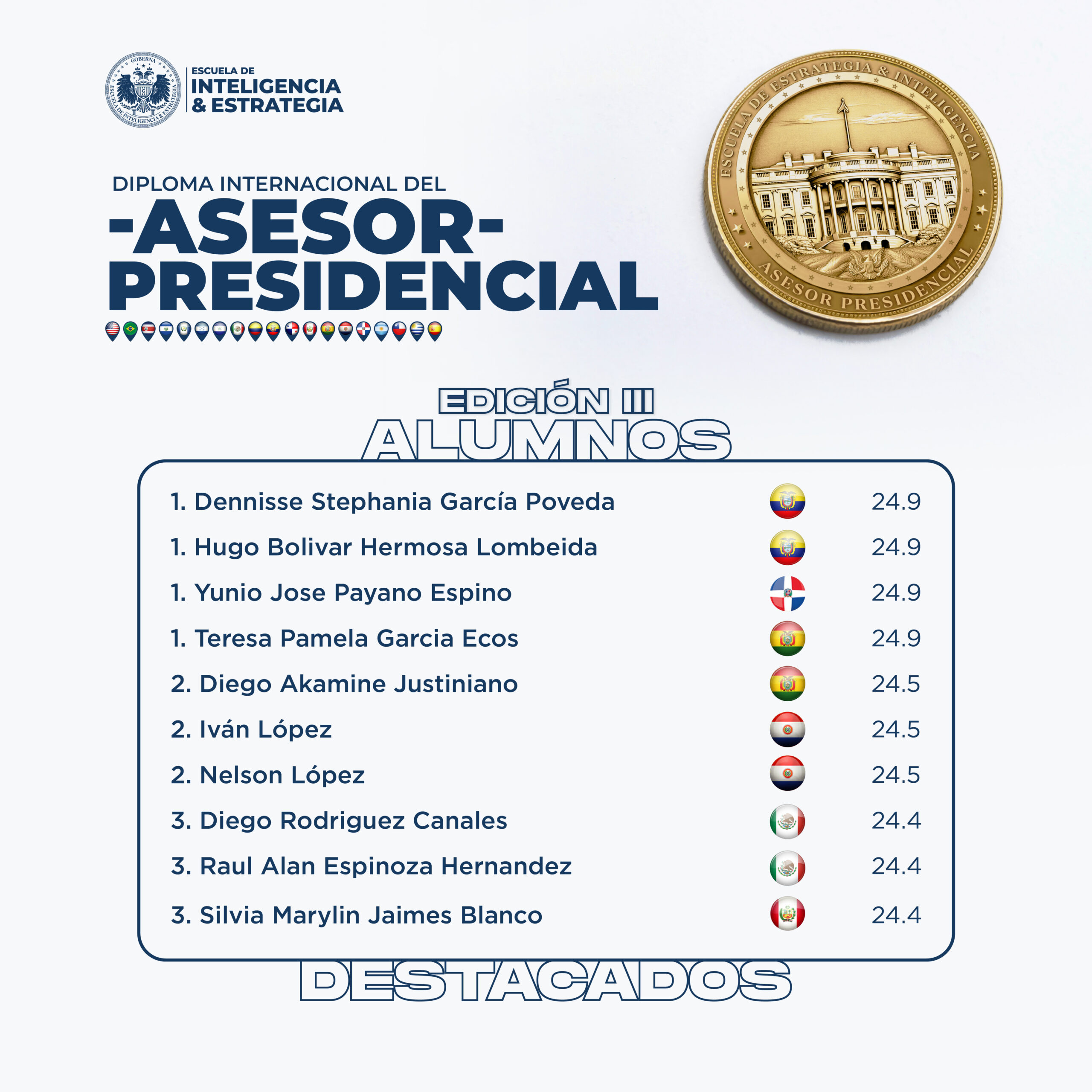 Felicitamos a los graduados de la Edición III del diplomado, quienes sobresalieron por su capacidad estratégica, discreción y dominio técnico en los entornos más exigentes del poder. Su preparación y compromiso representan un nuevo estándar de excelencia para quienes asesoran en la cúpula ejecutiva.