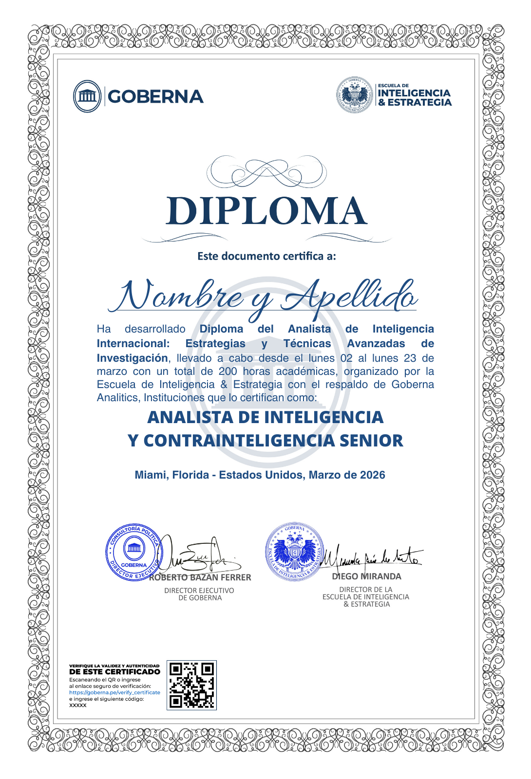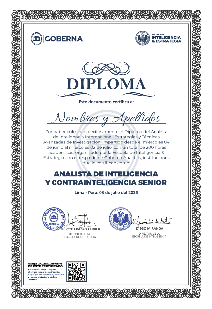 Al completar el programa, la Escuela de Inteligencia & Estrategia, con respaldo de Goberna Analytics, otorgará el certificado «ANALISTA DE INTELIGENCIA» (200 horas académicas).