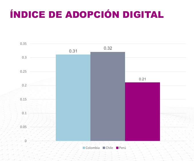El índice de adopción digital mide qué tan incorporada está la tecnología en la vida cotidiana de las personas. Aunque el Perú tiene una alta conectividad, su puntaje (0.21) muestra un uso todavía limitado frente a Chile (0.32) y Colombia (0.31). Es decir, los peruanos están conectados, pero aún no aprovechan plenamente lo digital.