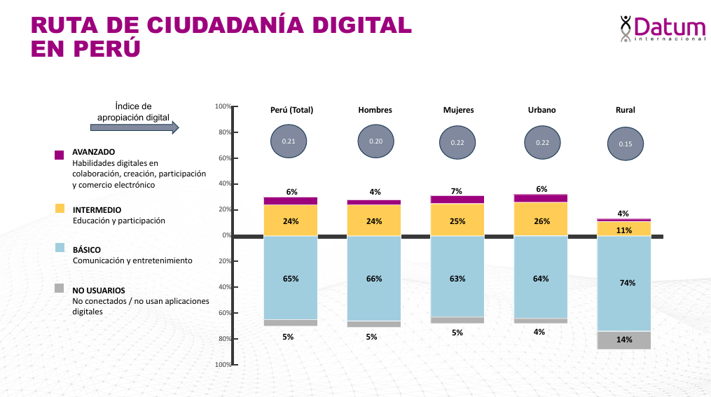 ¿A qué se debe esto? Se debe a que la población digital rural está conectada —más incluso que la urbana—, pero con un uso mucho más limitado. Según la Ruta de Ciudadanía Digital elaborada por Datum Internacional (2025), la mayoría de peruanos se encuentra en el nivel básico, dedicado a la comunicación y el entretenimiento, mientras que solo una minoría alcanza los niveles intermedio o avanzado. Esta brecha no refleja falta de acceso, sino una diferencia en los propósitos y habilidades con que la población se apropia del entorno digital.