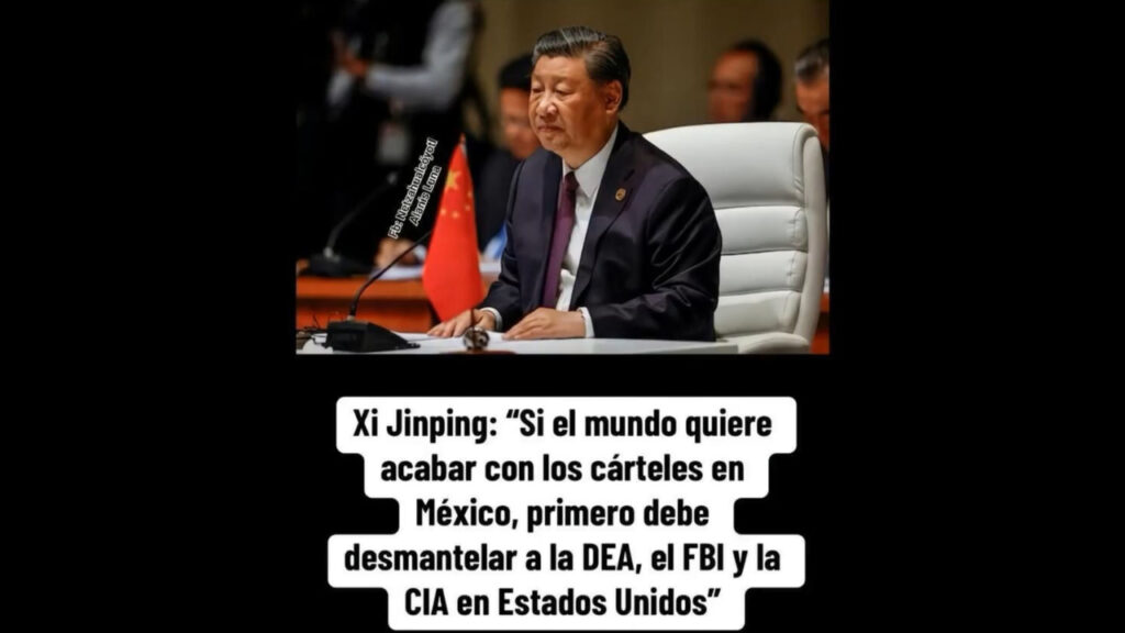 La versión más compartida del mensaje asegura que Xi Jinping habría declarado: “Si el mundo quiere acabar con los cárteles en México, primero debe desmantelar al FBI, la DEA y la CIA en Estados Unidos”. El formato en que se viralizó es una imagen con texto sobre un fondo genérico, sin fecha, lugar o contexto que permita verificar su autenticidad. Esto es un patrón común en la creación de noticias falsas: presentar una frase directa y polémica sin respaldo documental para provocar indignación y multiplicar su difusión.