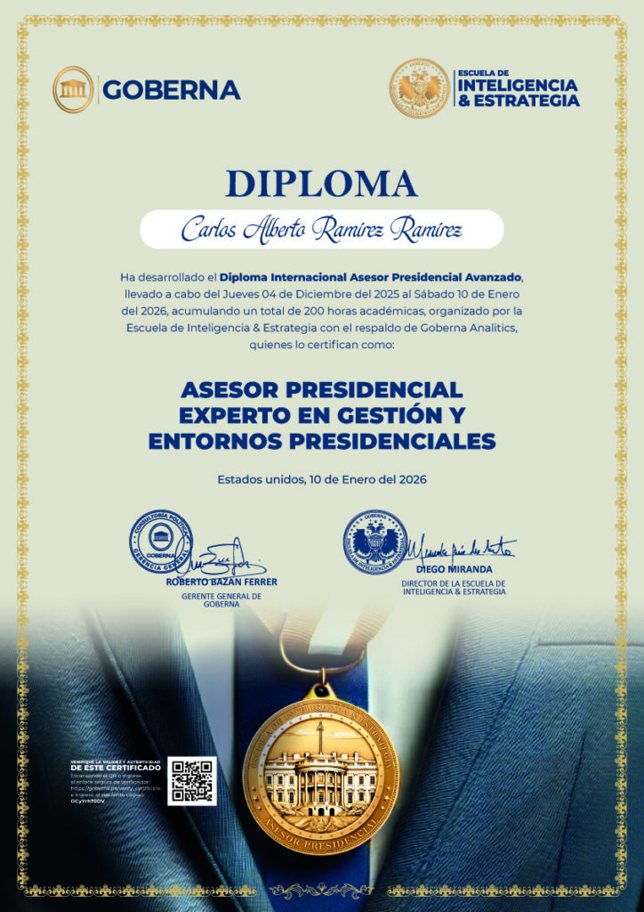 El Diploma Internacional del Asesor Presidencial Avanzado está diseñado para preparar asesores capaces de operar en los entornos más exigentes del poder ejecutivo. Según datos del Banco Interamericano de Desarrollo (BID) y el World Economic Forum (2024), la demanda de consultores en estrategia gubernamental y comunicación política ha crecido más de 45 % en América Latina durante los últimos cinco años, impulsada por la necesidad de gobiernos y líderes de fortalecer su capacidad de respuesta frente a crisis, desinformación y guerras narrativas. Este programa, con 200 horas académicas de formación intensiva, reúne a docentes internacionales con amplia trayectoria profesional. Su metodología teórico-práctica culmina con una Simulación Internacional War Room, donde los participantes asumen el rol de asesores presidenciales ante un caso de crisis global, fortaleciendo su red de contactos y sus habilidades para formular propuestas técnicas de consultoría política.