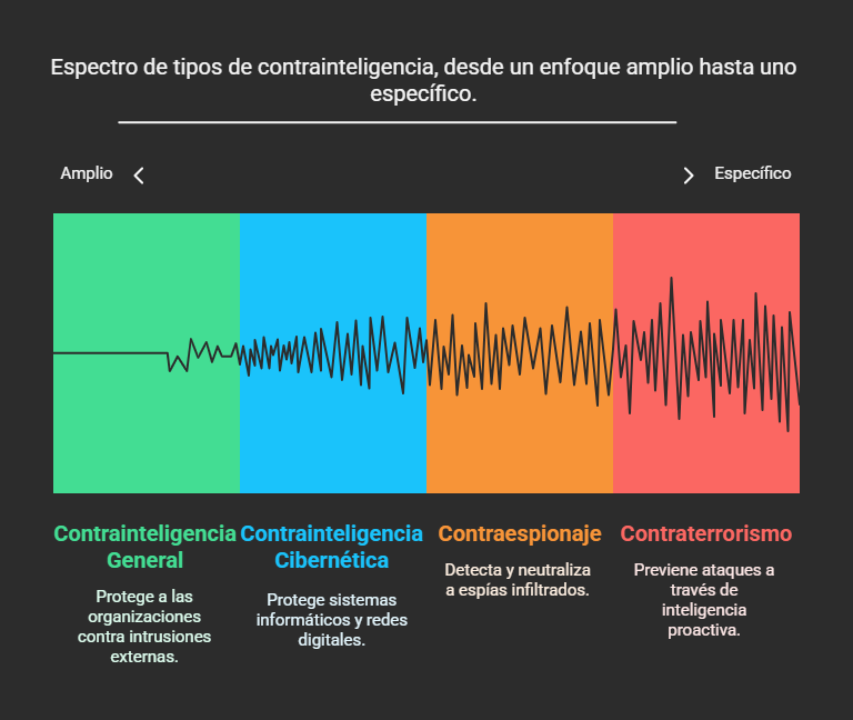 Estas actividades incluyen tanto la prevención y detección del espionaje, como la protección de personal, sistemas de información, infraestructuras críticas y estrategias organizacionales. La contrainteligencia actúa como escudo frente a: